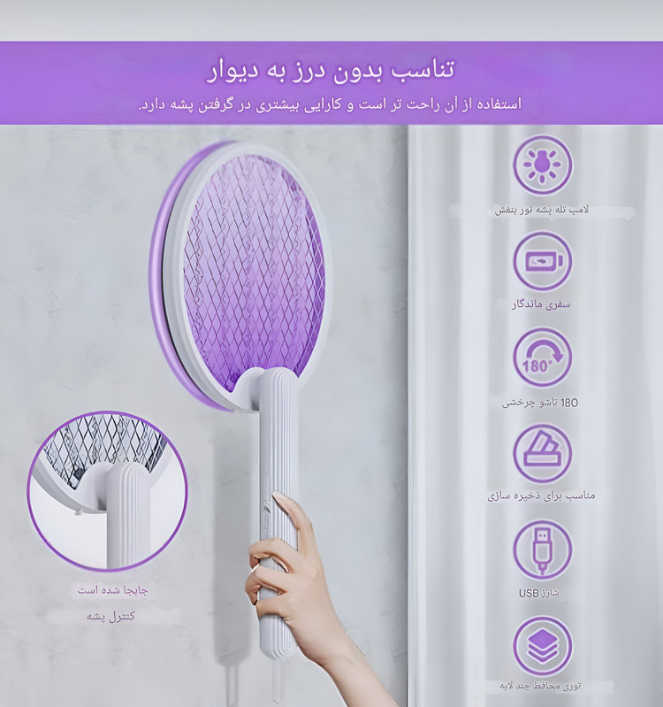 ✔ امکان ایستادن و عملکرد خودکار – با قرار دادن راکت روی پایه مخصوص، میتوان از آن بهعنوان یک دستگاه ایستاده برای جذب و دفع حشرات استفاده کرد.