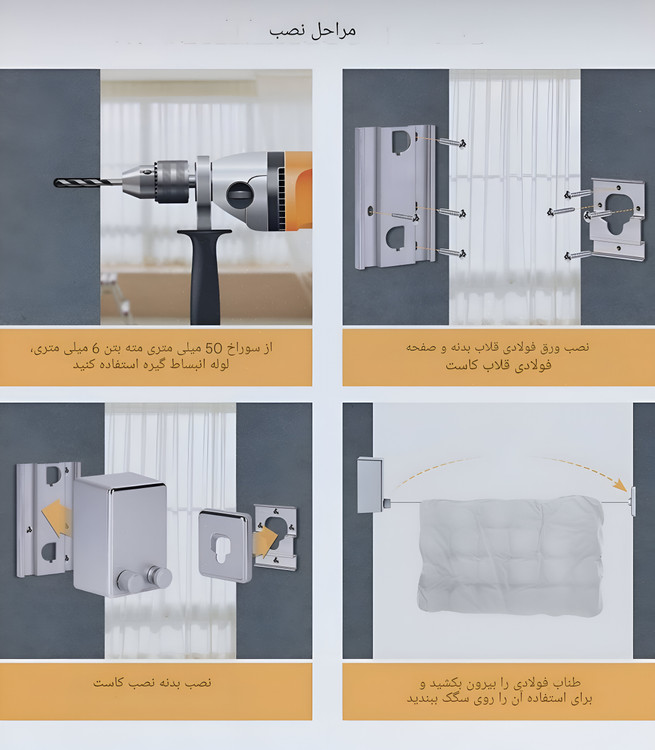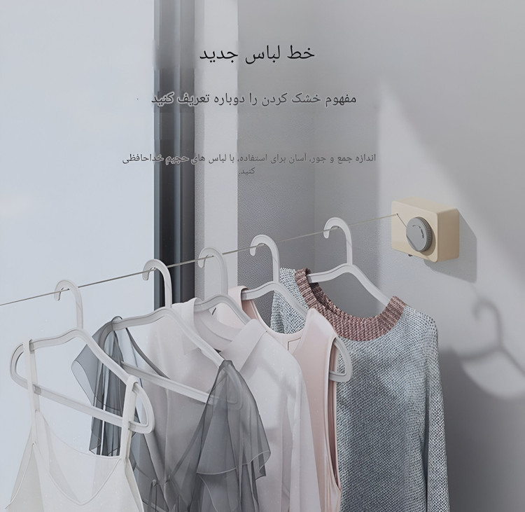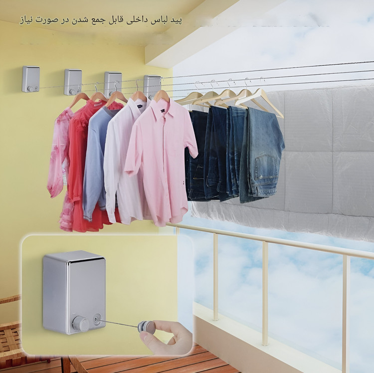 نصب این بند رخت بسیار ساده است و نیازی به ابزارهای پیچیده ندارد. تنها کافی است دستگاه اصلی را روی یک دیوار محکم نصب کنید و گیره مخصوص را در نقطه مقابل قرار دهید. با این کار، به راحتی میتوانید هر بار که نیاز دارید، بند را باز کرده و پس از استفاده دوباره جمع کنید.