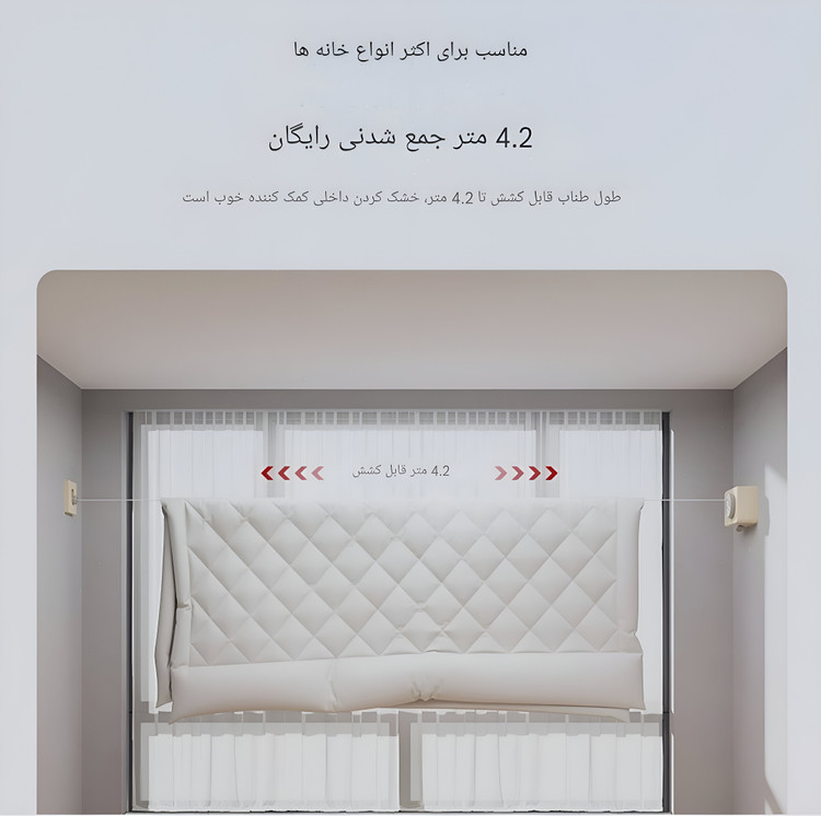 این محصول دارای طنابی با حداکثر طول 4.2 متر است که متناسب با فضای در دسترس شما قابل تنظیم میباشد. این ویژگی باعث میشود که بتوانید از آن در هر محیطی مانند حمام، تراس، بالکن یا حتی اتاق لباسشویی استفاده کنید.