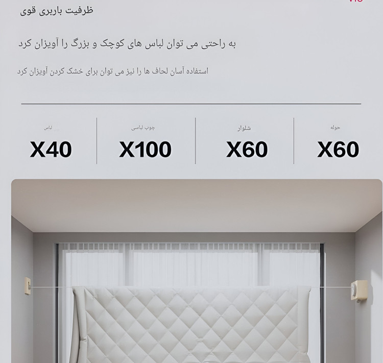 مناسب برای آپارتمانها و فضاهای کوچک – طراحی دیواری و جمعشونده این بند رخت، آن را به گزینهای عالی برای خانههایی با فضای محدود تبدیل کرده است