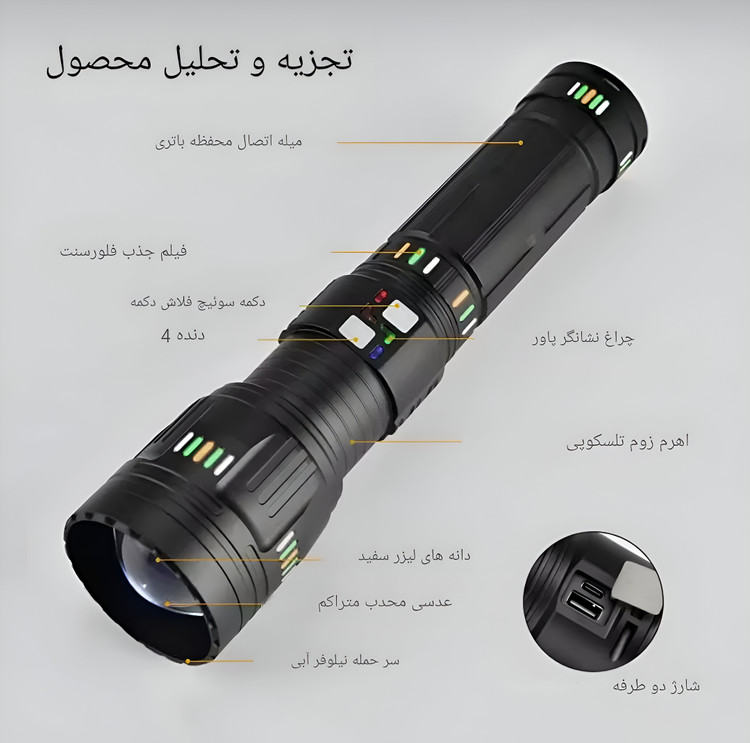 اگر به دنبال یک چراغ قوه حرفهای و چندمنظوره هستید که بتواند در هر شرایطی به شما کمک کند، چراغ قوه MULTIFUNCTION TELESCOPIC ZOOM FLASHLIGHT یک انتخاب ایدهآل است. این محصول با بهرهگیری از فناوری جذب نور فلورسنت و چیپ نسل جدید لیزر سفید، روشنایی فوقالعادهای را ارائه میدهد. طراحی مقاوم و ارگونومیک آن، این چراغ قوه را به گزینهای عالی برای کمپینگ، کوهنوردی، طبیعتگردی و حتی استفادههای اضطراری تبدیل کرده است.