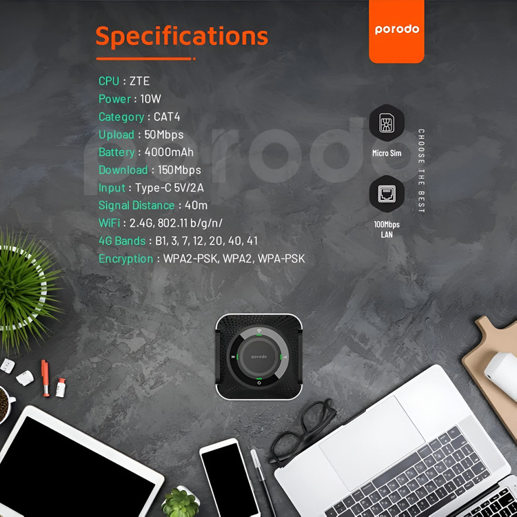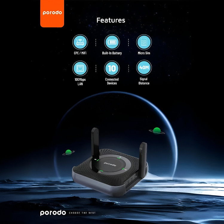 خرید مودم 4G/LTE قابل حمل پرودو مدل Porodo PD-4GCPMF | اینترنت پرسرعت در هر مکان