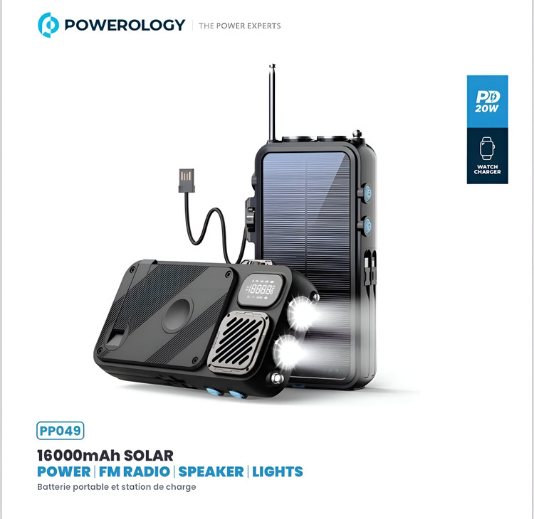 پاوربانک خورشیدی و اسپیکر بلوتوث پاورولوژی مدل Powerology PP049 با ظرفیت 16000 میلیآمپر ساعت، یک دستگاه چندکاره و حرفهای است که مخصوص کسانی طراحی شده که به سفر، طبیعتگردی، کوهنوردی و شرایط اضطراری علاقه دارند. این محصول با قابلیتهایی چون شارژ خورشیدی، دینام دستی، اسپیکر بلوتوث، رادیو FM، چراغ LED، ساعت دیجیتال و پورتهای متنوع، به یکی از کاملترین پاوربانکهای موجود در بازار تبدیل شده است.