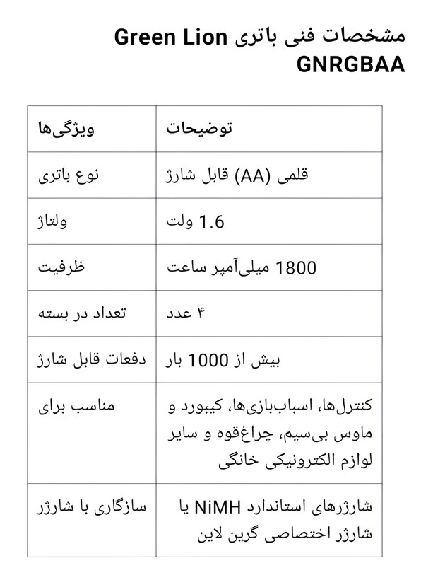 برای خرید باتری قلمی قابل شارژ Green Lion GNRGBAA، همین حالا اقدام کنید و انرژی پایدار را به دستگاههای خود هدیه دهید.