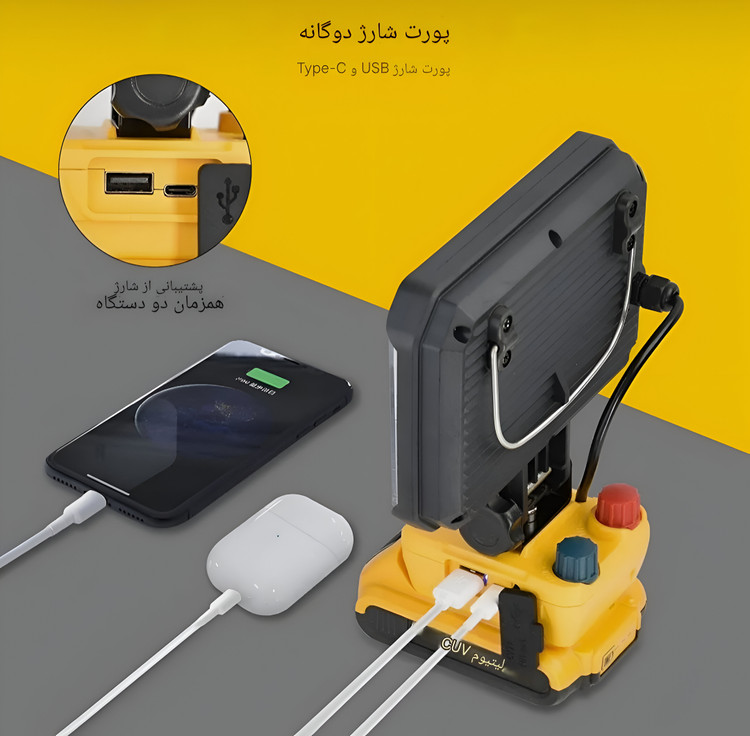 استفاده از باتری 18 ولت قابلتعویض، این چراغ را به گزینهای بلندمدت تبدیل میکند. همچنین شارژ Type-C، فرآیند شارژ را سریعتر کرده و امکان استفاده مجدد در زمان کوتاهتری فراهم میشود.