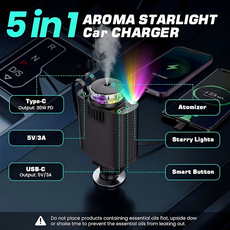این شارژر با ترکیب چند عملکرد در یک دستگاه، نهتنها نیاز شما به شارژ سریع را برطرف میکند، بلکه فضای خودرو را نیز دلپذیرتر میسازد. قابلیت پخش عطر در کنار نورپردازی آرامشبخش، تجربهای متفاوت از رانندگی ارائه میدهد، بهویژه در شب یا سفرهای طولانی.