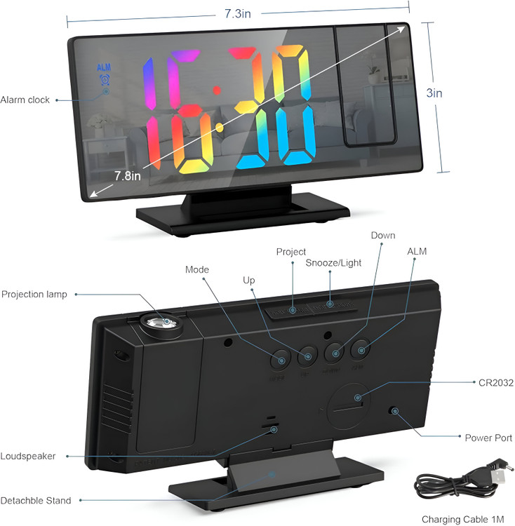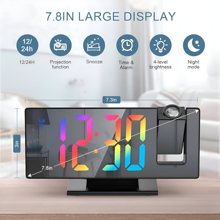 نمایشگر LED این ساعت از نوع دیجیتال و با رنگهای جذاب RGB است که در هر نور محیطی بهوضوح قابلمشاهده است. اعداد بزرگ و رنگی باعث شدهاند تا این ساعت حتی برای سالمندان یا افراد با بینایی ضعیف هم انتخابی مناسب باشد.
