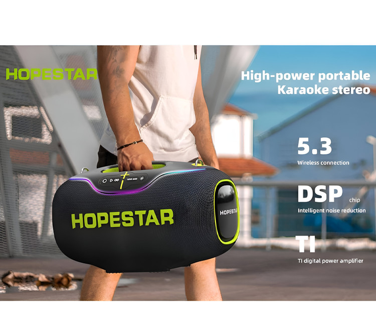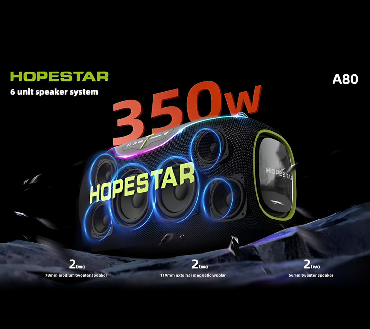 Hopestar A80 یکی از اسپیکرهای قابل حمل پرطرفدار در بازار است که به دلیل قدرت صدای بالا، امکانات حرفهای و طراحی مقاوم، توانسته توجه کاربران زیادی را به خود جلب کند. این اسپیکر با توان ۳۵۰ وات واقعی، مناسب استفاده در محیطهای باز، مهمانیها، مسافرت و دورهمیهای خانوادگی است.