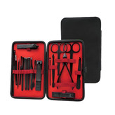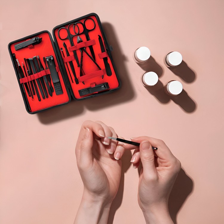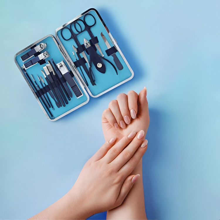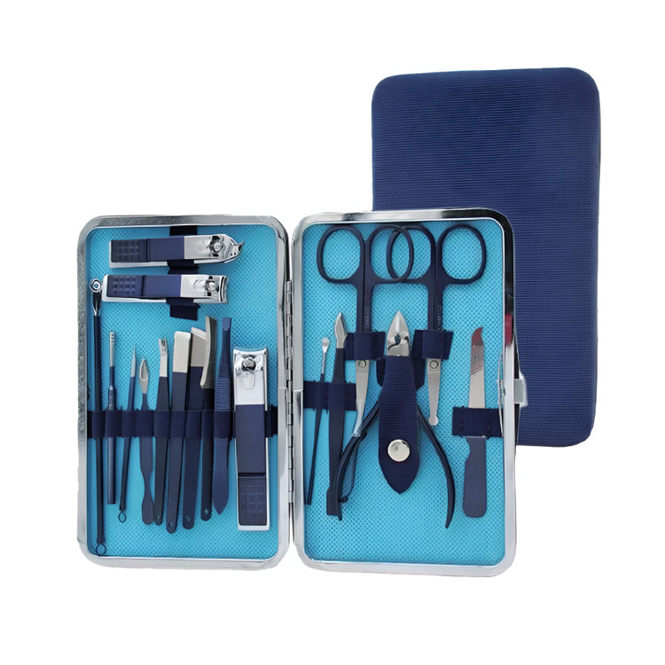 ۱۸ ابزار در یک مجموعه کامل: شامل انواع ناخنگیر، قیچی، موچین، سوهان ناخن، نیپر کوتیکول، ابزارهای پوستی و گوشپاککن.