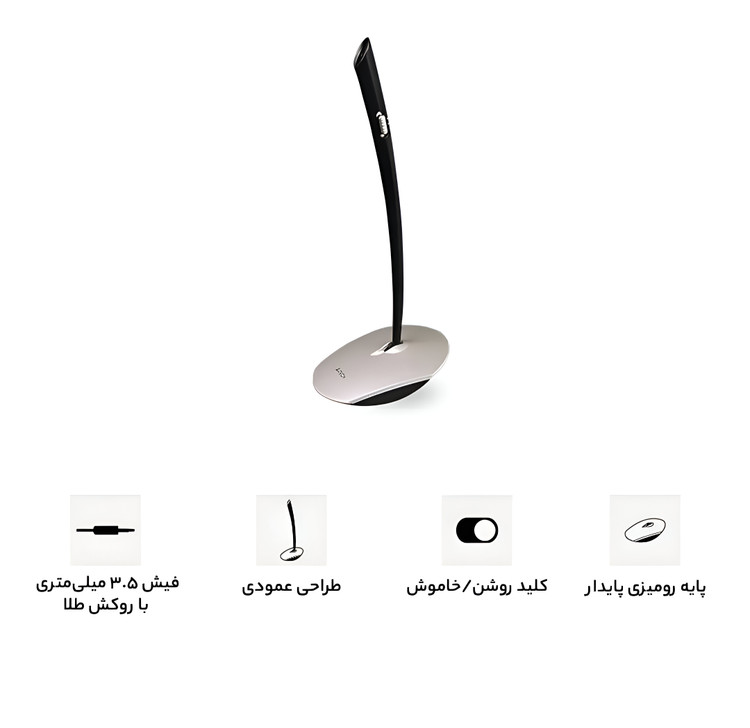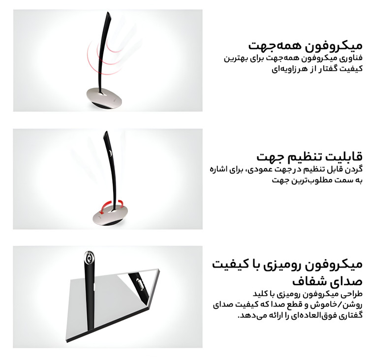 طراحی رومیزی با پایه پایدار: پایه مستحکم بهراحتی روی میز قرار میگیرد و از لغزش جلوگیری میکند. طراحی گردنی قابلانعطاف نیز به شما اجازه میدهد زاویه دریافت صدا را تنظیم کنید.