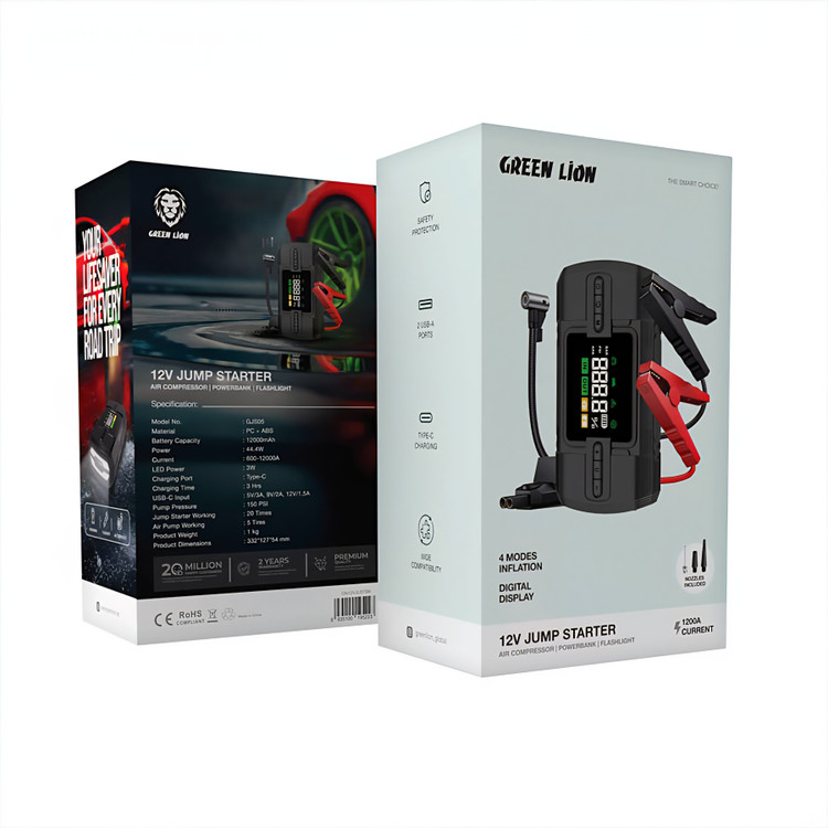 جامپ استارتر گرین لاین مدل GN12VJUSTBK با ظرفیت 12000 میلیآمپر – راهانداز خودرو، کمپرسور باد و پاوربانک در یک دستگاه!