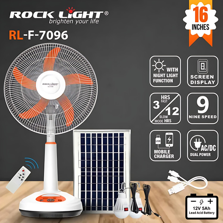 پنکه شارژی رومیزی راک لایت مدل RL-F-7096 همراه با پنل خورشیدی