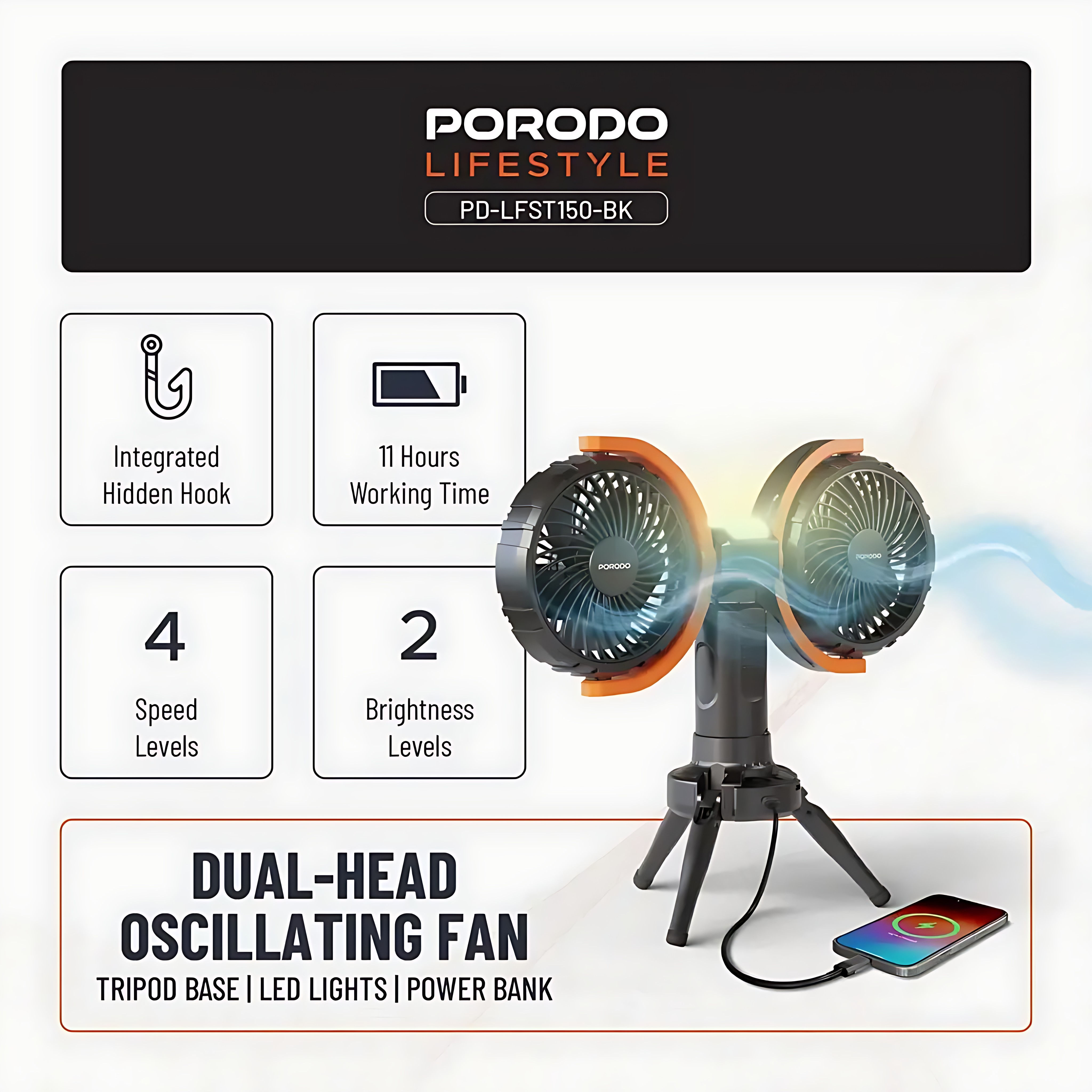 پنکه شارژی Porodo Lifestyle دو سر با چرخش و چراغ LED و پاور بانک