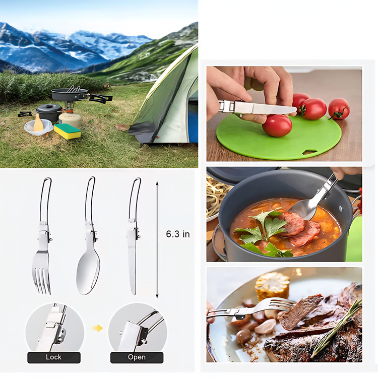 لوازم همراه اجاق کمپینگ، قاشق، چنگال، چاقو، ملاقه، کاسه، کفگیر چوبی، اسکاچ