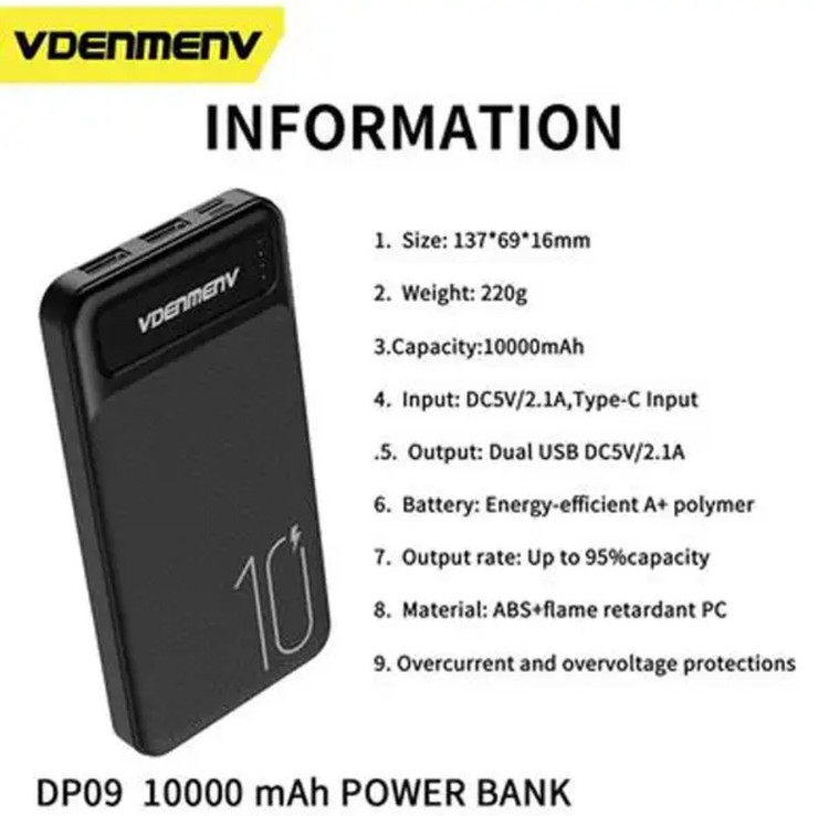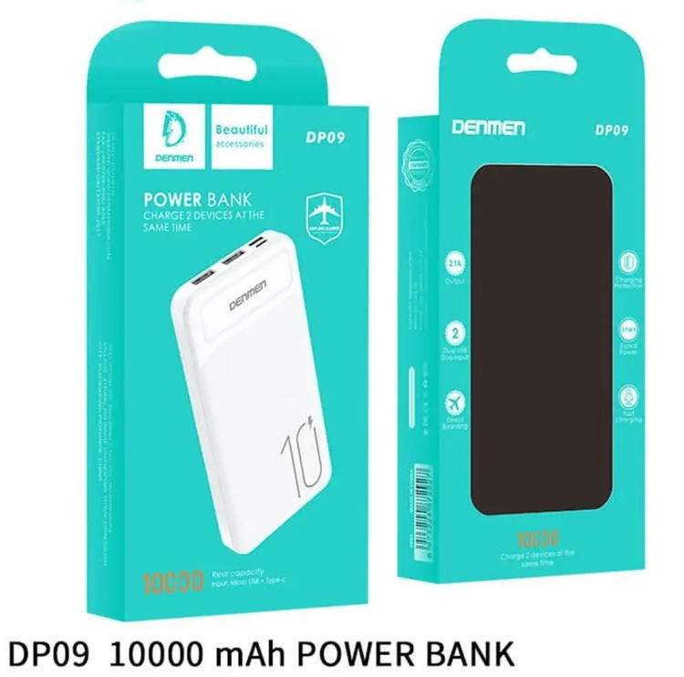 پاور بانک دنمن مدل DP09 یکی از بهترین گزینه ها برای جلوگیری از اتمام شارژ گوشی تلفن همراهتون این مدل دارای ظرفيت 10000 میلی آمپر ساعت و مدت زمان شارژ طولانی است همچنین دارای 2 پورت USB برای شارژ وسایل شما دارای نشانگر سطح شارژ LED فعال سازی دکمه می توانید در هر زمان سطح شارژ را بررسی کنید. حفاظت چند سطحی در برابر اتصال کوتاه و گرمای بیش از حد شارژ ایمن را تضمین می کندف بدنه این پاور بانک از مواد ضد حریق ساخته شده است. باتری پلیمری A با دوام و کم مصرف یکی از قابلیت های ویژه این پاوربانک است و همچنین قابلیت شارژ پاوربانک از طریق کانکتورهای Type-C و Micro USB میسر است