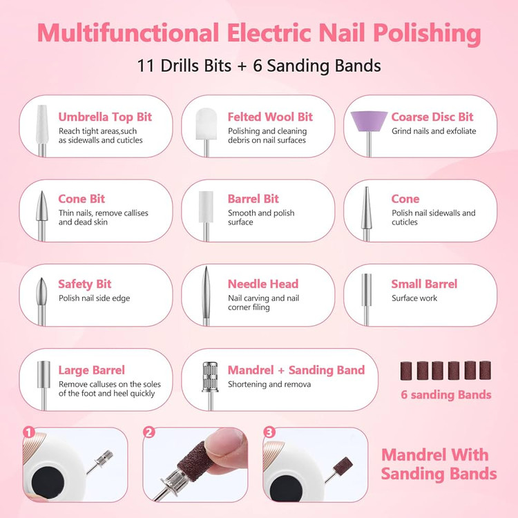 مجموعهای از سریهای فلزی و سنبادهای به شما اجازه میدهد ناخن را با دقت و ظرافت بالا شکل دهید، صاف کنید یا پولیش کنید.