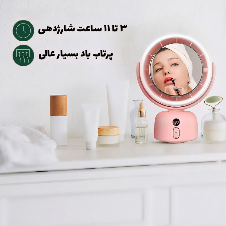 در کنار نور LED، این محصول به پنکه داخلی با پنج سرعت مختلف مجهز است. جریان هوای تولیدی بین ۳.۲ تا ۵ متر بر ثانیه است و در روزهای گرم یا هنگام آرایش طولانیمدت، حس خنکی کاملاً محسوس ایجاد میکند. صدای پنکه بین ۵۰ تا ۶۵ دسیبل قرار دارد که برای محیط اتاق و میز آرایش مناسب و قابلتحمل است. قابلیت چرخش ۹۰ درجه نیز کمک میکند هوا دقیقاً در زاویه دلخواه جریان پیدا کند.