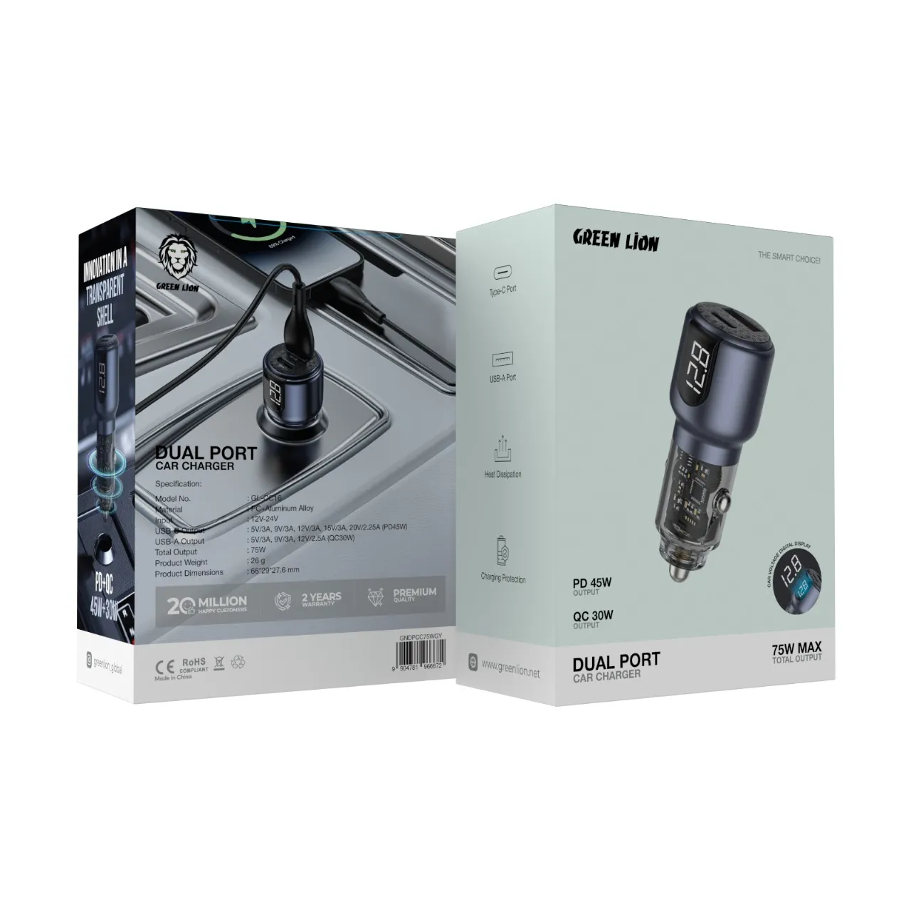 شارژر فندکی 75 وات Green Lion مدل Dual Port Car Charger PD+QC 75W