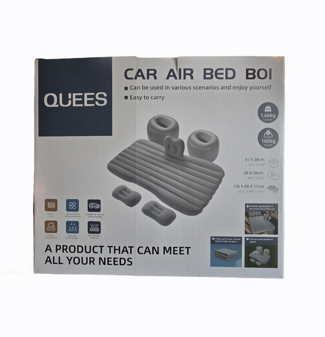 تشک بادی خودرو QUEES یک راهحل هوشمندانه برای استراحت، سفر، کمپینگ و استفاده روزمره در خودرو است. این محصول با طراحی چندمنظوره و ساختار چندمحفظهای، بهراحتی فضای صندلی عقب خودرو را به یک تخت نرم و ایمن تبدیل میکند و در عین حال قابلیت استفاده در فضای باز و داخل منزل را هم دارد.