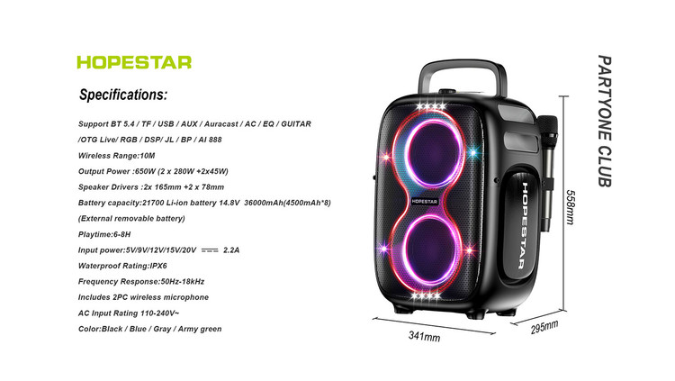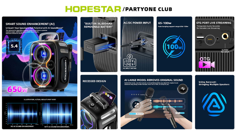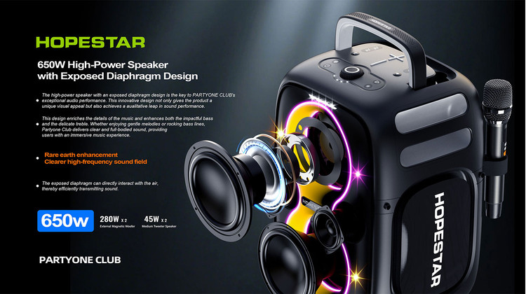 اسپیکر Hopestar Partyone Club 650W AI | اسپیکر و کارائوکه قدرتمند همراه با هوش مصنوعی