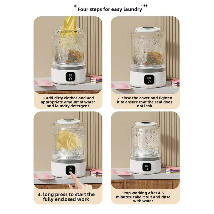 این ماشین لباسشویی قابل حمل با ابعاد کم و وزن سبک طراحی شده و بهراحتی در کیف یا چمدان جا میگیرد. بدون نیاز به اتصال دائم به برق، میتوانید آن را در هر جایی استفاده کنید. طراحی مینیمال و بدنه باکیفیت، حس یک گجت هوشمند و مدرن را به شما میدهد.