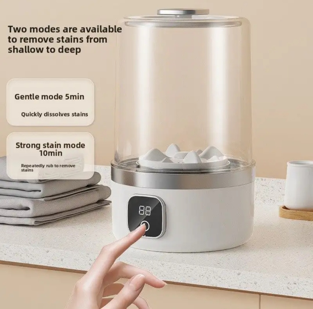 این ماشین لباسشویی قابل حمل با ابعاد کم و وزن سبک طراحی شده و بهراحتی در کیف یا چمدان جا میگیرد. بدون نیاز به اتصال دائم به برق، میتوانید آن را در هر جایی استفاده کنید. طراحی مینیمال و بدنه باکیفیت، حس یک گجت هوشمند و مدرن را به شما میدهد.