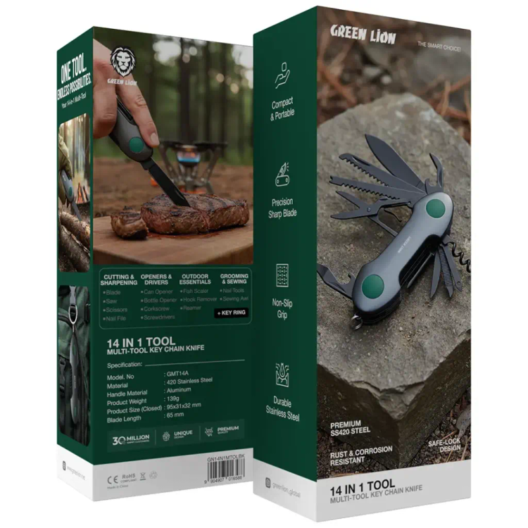 ابزار چندکاره گرین لاین 14 در 1 Multi Tool Key Chain Knife یک همراه کوچک، سبک و باورنکردنی کاربردی است که در قالب یک چاقوی چندکاره جاکلیدی طراحی شده تا همواره در کنار شما باشد. این محصول ترکیبی از ۱۴ ابزار ضروری را در یک بدنه جمعوجور ارائه میدهد و بهعنوان یک ابزار Everyday Carry (ابزار همراه روزانه)، سفر، کمپینگ، طبیعتگردی و شرایط غیرمنتظره، انتخابی هوشمندانه است.