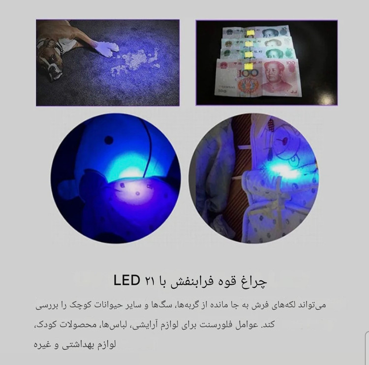 این چراغ قوه علاوه بر شناسایی عقرب، برای کاربردهای دیگری هم مفید است؛ مثل پیدا کردن لکههای نامرئی، بررسی اسکناس، شناسایی برخی حشرات، یا استفادههای عمومی در کمپ و طبیعت.
