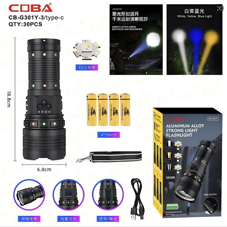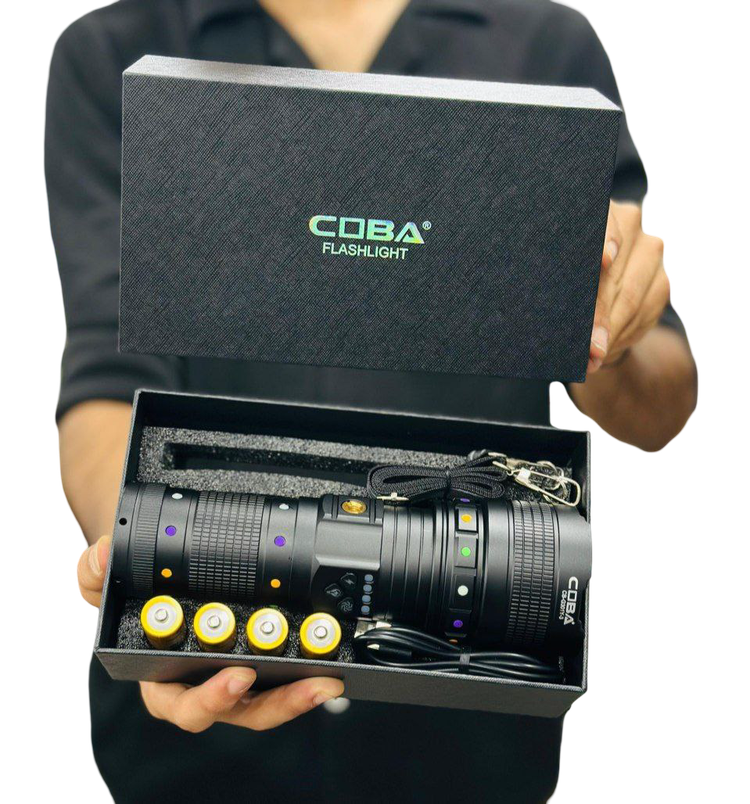 چراغ قوه حرفه‌ای COBA مدل CB‑G301Y-3 – دارای نور سه رنگ و بدنه آلومینیومی ضد ضربه و پاور بانک