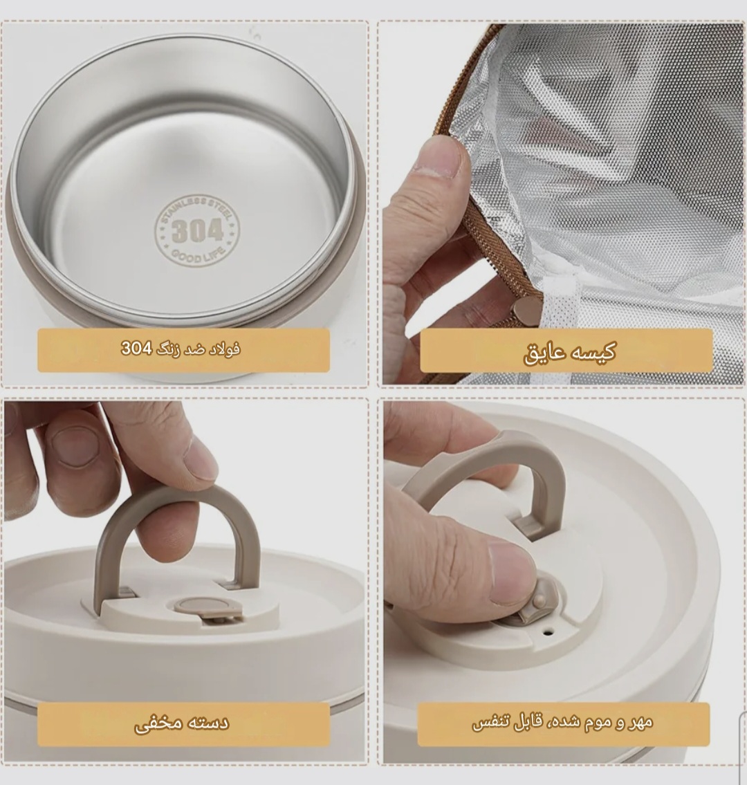 در هر ظرف یک ظرف استیل ۳۰۴ جداشونده قرار دارد که باعث میشود غذا بهتر حفظ شود و از تماس مستقیم با پلاستیک جلوگیری کند، ضمن اینکه واشر درب مانع از نشت غذا میشود.