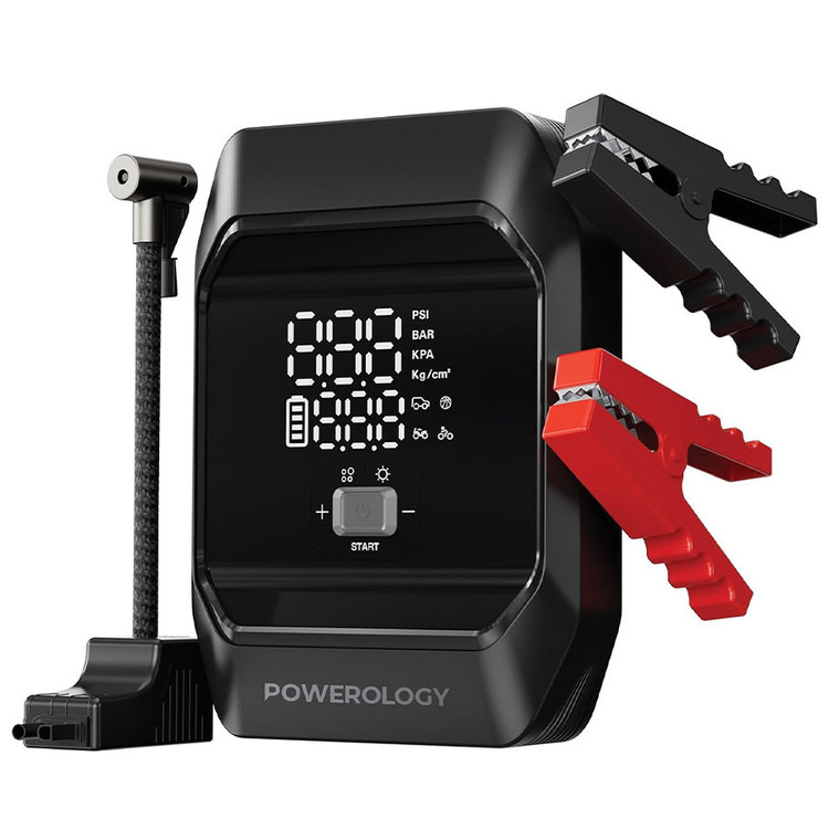 Powerology Inflate Boost Jump Starter & Air Compressor مدل PWKF03M یک ابزار چندکاره قابلحمل برای هر خودرو، موتور سیکلت یا سفر خارج از شهر است. این دستگاه طراحی جمعوجور و کاربردی دارد و در مواقع اضطراری میتواند همزمان باتری خودرو را استارت بزند، لاستیکها را باد کند و وسایل دیجیتال شما را شارژ کند — همه در یک دستگاه سبک و قوی.
