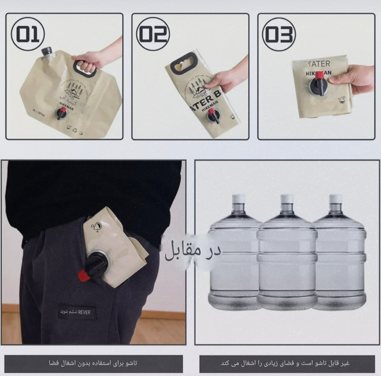 پس از تخلیه آب، کیسه به راحتی تا شده و فضای کمی اشغال میکند، که این ویژگی حمل آن را بسیار آسان میسازد.