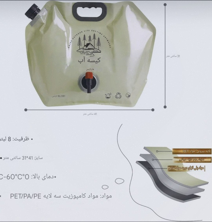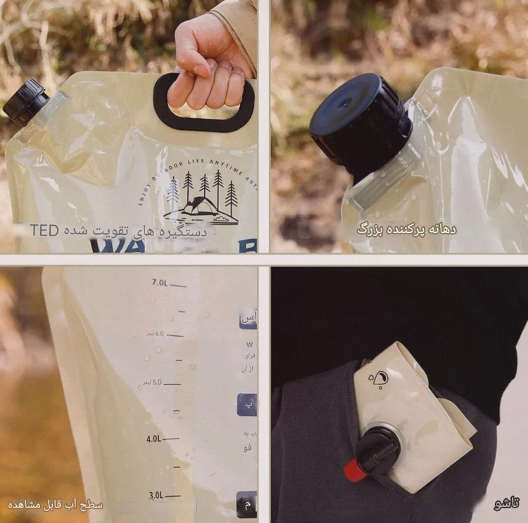 ساخته شده از مواد غیرسمی، بدون BPA و مقاوم در برابر پارگی و فشار، که آب را در شرایط ایمن و بهداشتی نگه میدارد.