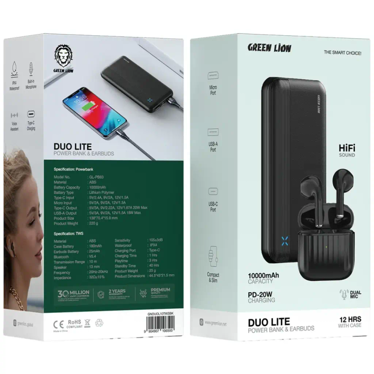 اگر به دنبال یک محصول هوشمند و همهکاره هستید که هم شارژ همراه قدرتمند و هم هدفون بلوتوثی با کیفیت صدا خوب را در یک بسته داشته باشد، Green Lion Duo Lite انتخابی هوشمندانه است. این محصول ترکیبی از پاوربانک 10000 mAh با قابلیت شارژ سریع و ایربادز بیسیم (TWS) با کیفیت صدای Hi-Fi میباشد که در طراحی کوچکتر و سبک برای استفاده روزمره، سفر یا فعالیتهای ورزشی ساخته شده است.