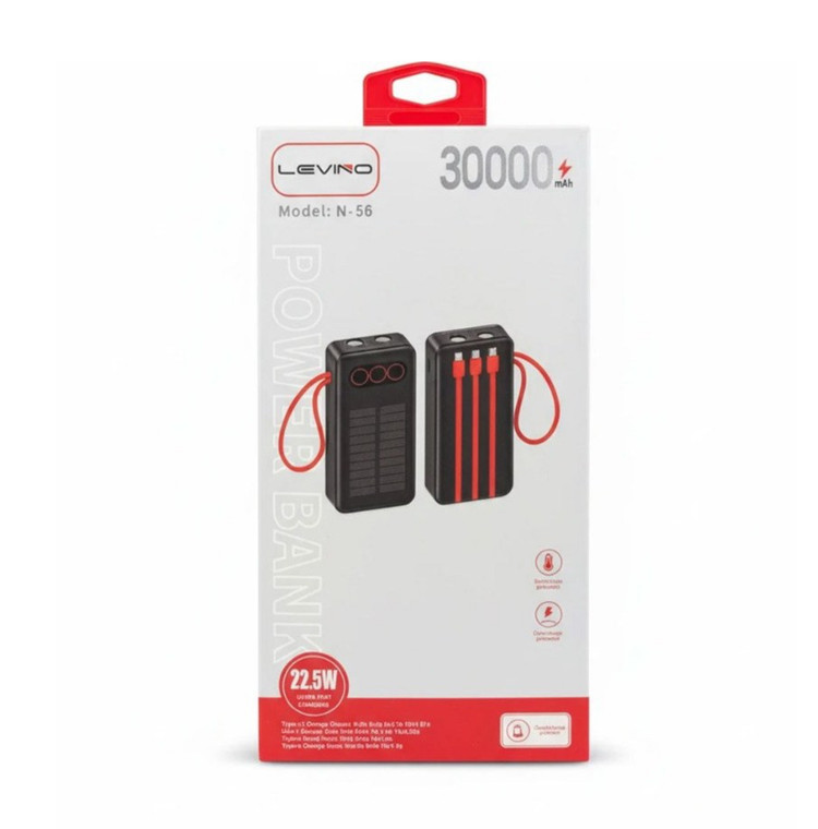 پاور بانک خورشیدی LEVINO مدل N-56 ظرفیت 30000mAH | شارژ سریع ۲۲.۵ وات