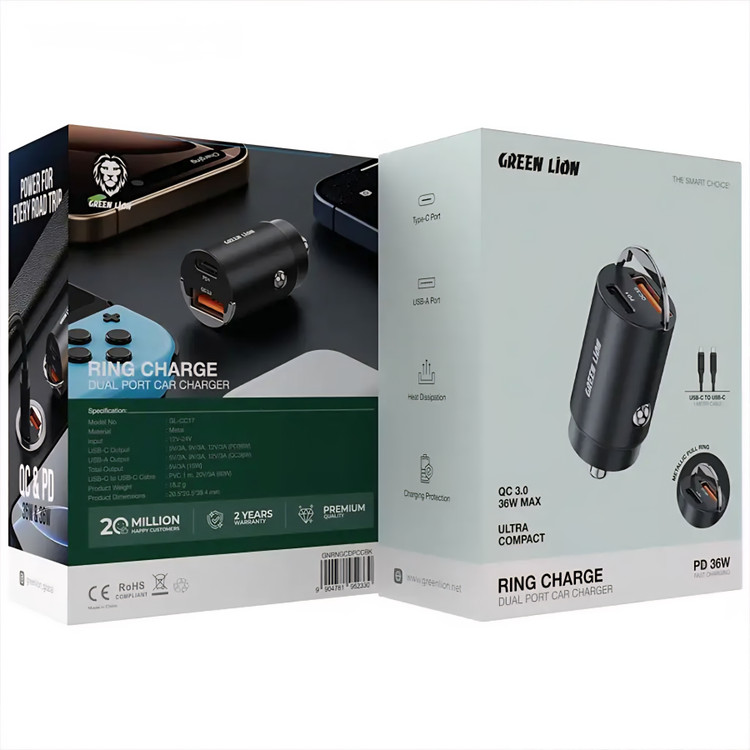 اگر دنبال یک شارژر فندکی حرفهای هستید که هم سریع، هم ایمن و هم زیبا باشد، Green Lion Ring Charge Dual Port Car Charger PD 36W انتخاب ایدهآل شماست. این شارژر با طراحی جمعوجور و مدرن، مناسب برای تمامی خودروهای سواری و حتی وسایل نقلیه سنگین با ورودی ۱۲ تا ۲۴ ولت است. با دو پورت خروجی، این محصول به شما امکان شارژ همزمان دو دستگاه مختلف را میدهد، بدون اینکه نگرانی از آسیب به باتری داشته باشید.