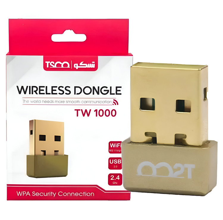 با فراگیر شدن تکنولوژی WIFI و وجود مودم های بی سیم در اکثر خانه ها و ادارات و محل کارها نیاز به دریافت کننده ی این امواج بیش از پیش احساس میشود. تعداد بسیار زیادی از پی سی های قدیمی و يا حتى جديد فاقد گیرنده ی داخلی WIFI هستند و برای همین باید یا با کابل به اینترنت وصل شوند یا به گیرنده مجهز شوند. دانگلهای WIFI این مشکل را برطرف کرده اند. با وصل کردن دانگل WIFI به پورت USB دستگاه کامپیوتر شما به راحتی به اینترنت وصل میشود و دیگر نیازی به باز کردن کیس کامپیوتر و قرار دادن قطعه ی گیرنده ی WIFI داخل دستگاه نخواهد بود. کارت شبکه ی 1000 محصولی از برند تسکو است که از طریق USB به رایانه متصل میشود. ابعاد این کارت شبکه مانند یک فلش مموری بند انگشتی است که به راحتی می توان را به رایانه متصل کرد و از وجود شبکه ی بی سیم لذت برد. از ویژگی های بسیار خوب این محصول میتوان به پشتیبانی آن از سیستم عامل های رایج و به خصوص نسخه های مختلف سیستم عامل ويندوز اشاره کرد. این کارت شبکه از استاندارد IEEE 802.11 b g n پشتیبانی میکند و برای بالابردن امنیت شبکه از تنظیمات امنیتی WEP WPA/WPA2 بهره می برد
